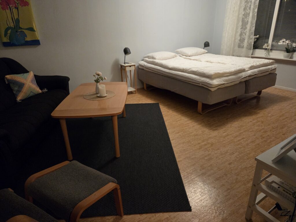 Lägenheten består av ett vardagsrum med inglasad balkong, sovalkov och kök. Fullt möblerad med två enkelsängar, en våningssäng samt en fällbar extrasäng. Köksutrustning för frukost och enklare måltid finns.